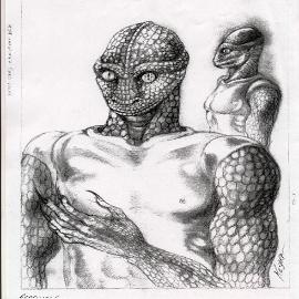 “He stopped and it made eye contact with me and I could see him clearly. The eyes were kind of like a snake’s, but black and with a yellow stripe in the middle of the eye. It had green and red scales on the face and head. The red color was kind of like the same as the desert sand there, and it looked like it had a sandy texture too. It didn’t have a nose, only two holes on it. I couldn’t see any ears or hair. A red mouth that looked like it had blood around it, but it didn’t look like it was bleeding, it looked like a pattern. It reminded me of a chameleon, but it looked like a person too.”